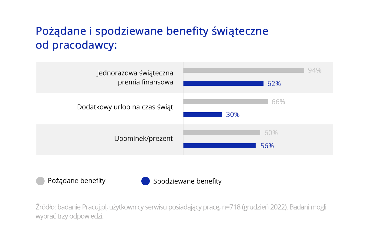 Świąteczny czas stanowi okazję dla pracodawcy do zapewnienia pracownikom okolicznościowych benefitów – zarówno finansowych, jak i pozapłacowych. Tego typu prezenty mogą wpływać pozytywnie na relacje z zespołem, a także wizerunek firmy jako pracodawcy. Jak co roku, oczekiwania zespołu mogą się jednak rozmijać z realnymi planami pracodawców. Tę sytuację obrazuje widoczny w badaniu Pracuj.pl rozdźwięk między benefitami, których pożądają pracownicy, a tymi, których realnie się spodziewają.