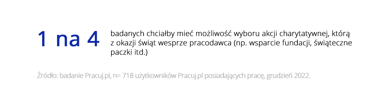 Warto zwrócić uwagę na kwestię, jaką są działania charytatywne realizowane z okazji świąt. Wsparcie fundacji, osób potrzebujących, kiermasze dobroczynne to wydarzenia, które można obserwować od wielu lat, szczególnie w dużych firmach. Stosunkową nowością jest natomiast oddawanie pracownikom wyboru, jaka instytucja lub akcja będzie wspierana z okazji świąt. Możliwość wpływu na tę kwestię jest istotna dla 23% badanych.