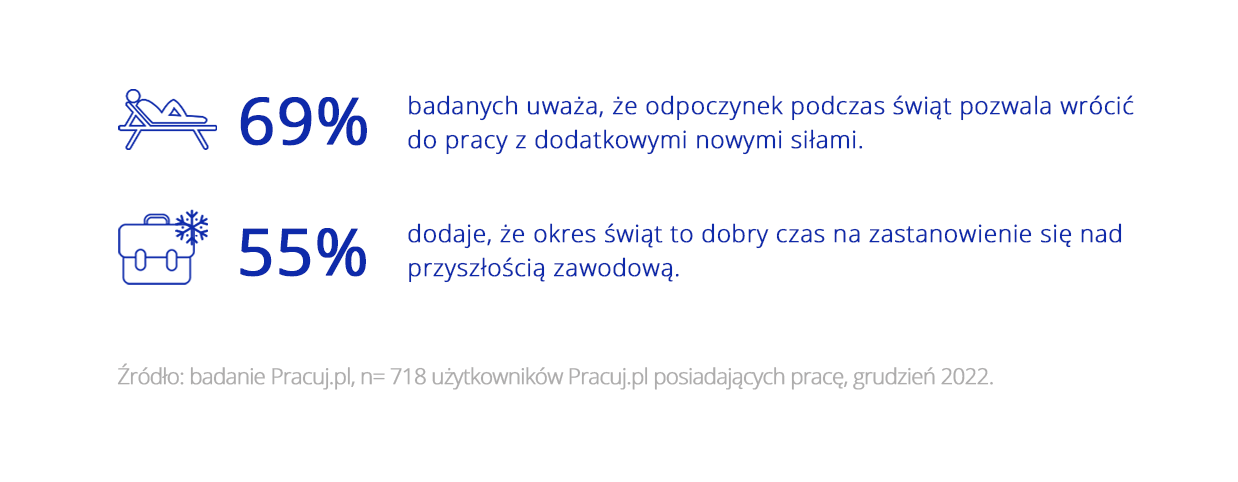 Niezależnie od planów urlopowych, koniec grudnia to dla większości pracujących okazja do odpoczynku, wejścia w dobry humor, odcięcia się od najważniejszych zawodowych wyzwań czy spokojnych podsumowań. „Naładowanie baterii” w tym czasie jest szczególnie ważne, bo po nim następują długie miesiące zimy i oczekiwania na letnie urlopy. Trudno się więc dziwić, że według ponad 2/3 respondentów Pracuj.pl odpoczynek podczas świąt pozwala im wrócić później do pracy z dodatkowymi siłami.