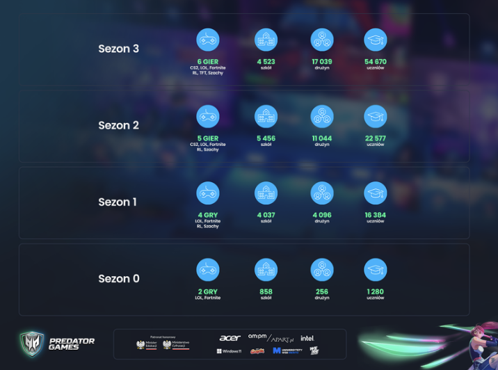 Inicjatywa buduje pozytywną i bezpieczną przestrzeń do rywalizacji, rozwoju i współpracy, skutecznie przełamując stereotypy dotyczące gamingu oraz wzmacniając relację młodych ludzi z marką Predator. Projekt, prowadzony w formule sezonowej, w ciągu niespełna trzech lat przeszedł drogę od pilotażu do rangi największego turnieju esportowego dla szkół w Europie, a każdy kolejny sezon pobija nowe rekordy popularności.
