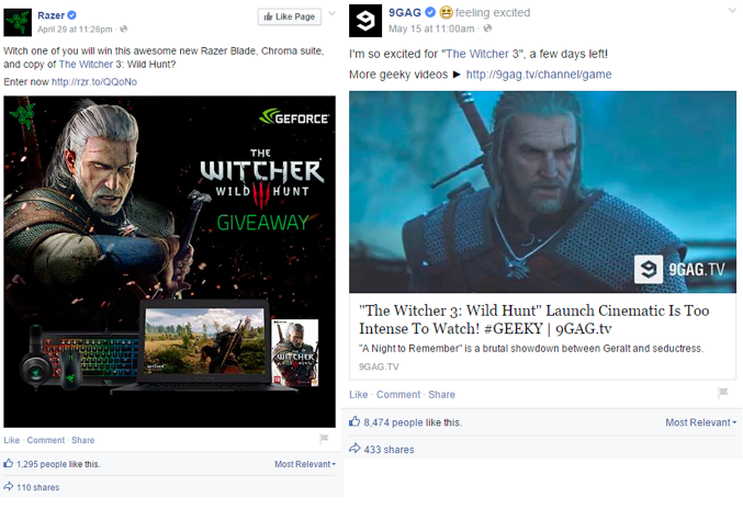Siłę brandu często poznaje się po tym, jakie zaangażowanie wzbudza wśród innych marek. Tak głośne wydarzenie – ogromnie ważny był tu sukces poprzednich części gry – nie mogło umknąć uwadze administratorów fanpage’y, stąd też Wiedźmin zdążył się już pojawić w parze z produktami gastronomicznymi, alkoholem czy innymi tworami kultury. Marki mniej lub bardziej udanie nawiązywały do wydarzenia, a z ciekawszych kreacji warto wymienić Luksusową czy Żywca. Z Dzikim Plonem pod komunikację podpięło się również Frugo, o którym pisałem ostatnio. Ogromnie musi cieszyć fakt, że wiedźmiński hype wykorzystywały nie tylko polskie fanpage’e, ale także światowe, o ogromnych zasięgach (przykładem niech będzie Razer czy 9gag).