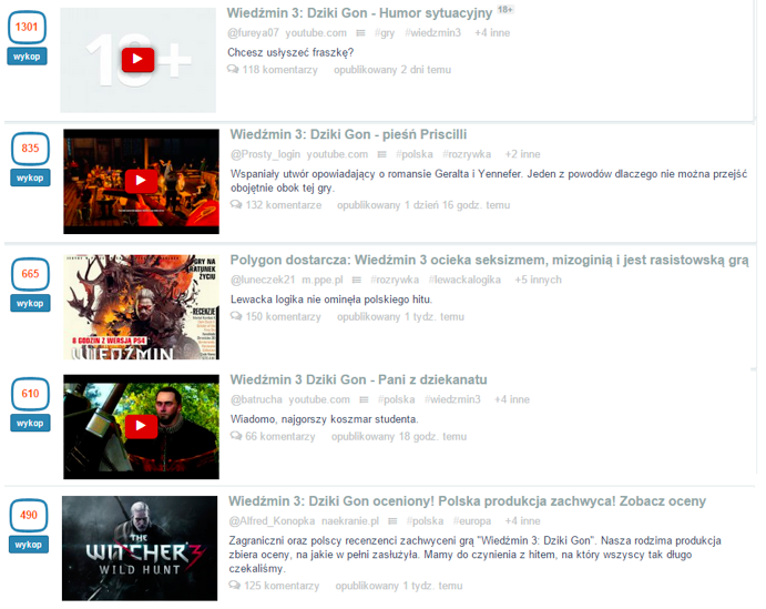 Jednak Wiedźmin pojawia się nie tylko w kontekście komunikacji brandów. Ponad 20 milionowy zasięg został wygenerowany przy ogromnym udziale konsumentów. Na portalach rozrywkowych do tej pory pojawiły się już setki tematów o Geralcie, dyktowane głosem społeczności. Na samym tylko Wykopie, 5 najpopularniejszych wątków o Wiedźminie w przeciągu ostatniego tygodnia uzbierało niemal 4 000 wykopów, co przełożyło się na około 88 000 odsłon tychże. Jeśli dodać do tego mniejsze serwisy i strony na Facebooku, zasięg liczony w dziesiątkach milionów przestaje zaskakiwać.