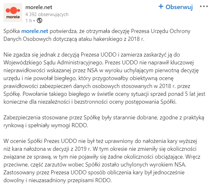 Spółka Morele.net wydała w powyższej sprawie odpowiednie oświadczenie, które umieściła na swoim profilu na LinkedInie.