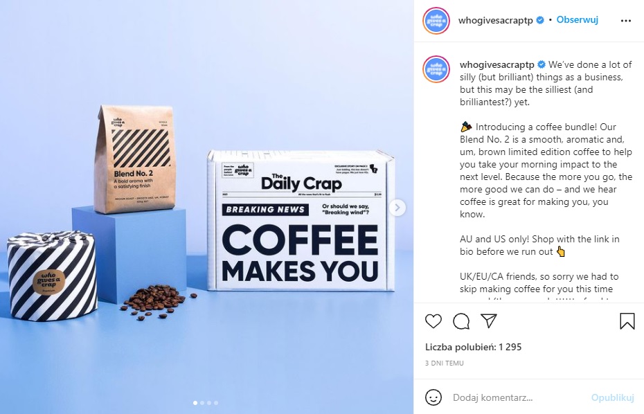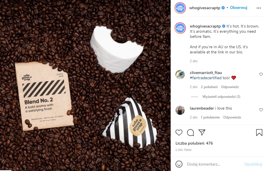 W celu zwiększenia sprzedaży papieru toaletowego – a tym samym pomnożenia środków przeznaczonych na cele charytatywne – marka postanowiła rozbudować swoją ofertę o… paczki z kawą.