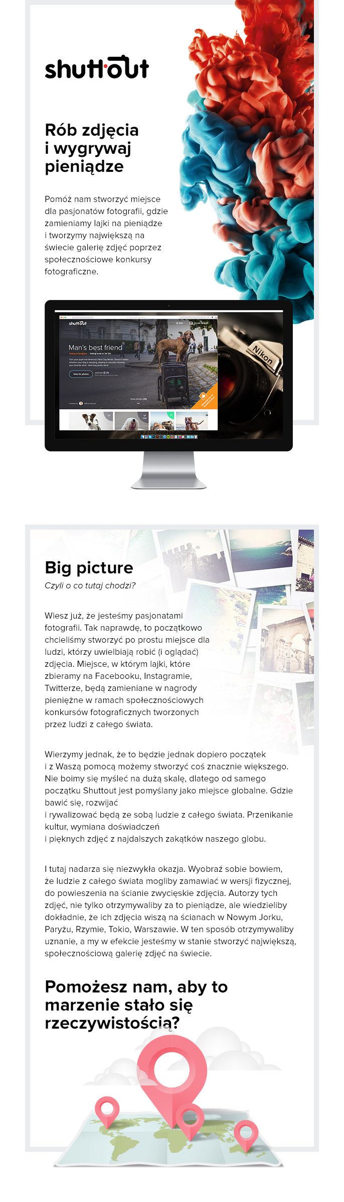 Shuttout.com to miejsce dla wszystkich, którzy kochają robić zdjęcia, ale konkursy fotograficzne nie są dla nich dostępne ze względu na wysokie wpisowe, profesjonalną konkurencję lub jury złożone z zawodowców. Ideą, która przyświecała twórcom shuttout.com było sprawienie, by amatorzy fotografii mogli rozwijać swoje umiejętności oraz dotrzeć ze swoimi pracami do szerokiego grona odbiorców. Każdy, kto zarejestruje się w serwisie, będzie mógł stworzyć konkurs fotograficzny, w którym do zdobycia będą nagrody pieniężne uzależnione od wysokości wpisowego lub wziąć udział w już trwającym. W ramach takich konkursów nagradzane będą nie tylko najlepsze prace, ale też najbardziej aktywni użytkownicy dzielący się swoją wiedzą i użytecznymi wskazówkami. Na organizacji zarobi także pomysłodawca. W regulaminie jest dla niego przeznaczone aż 10% uzbieranej kwoty.