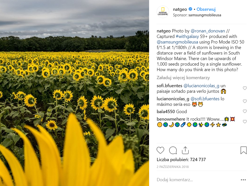Przykładem na to jest post sponsorowany przez Samsunga, przy którym jedynie wspomniano, że zdjęcie zostało zrobione urządzeniem marki. Natomiast pozostała treść opisu poświęcona jest samej fotografii, a nie producentowi elektroniki.