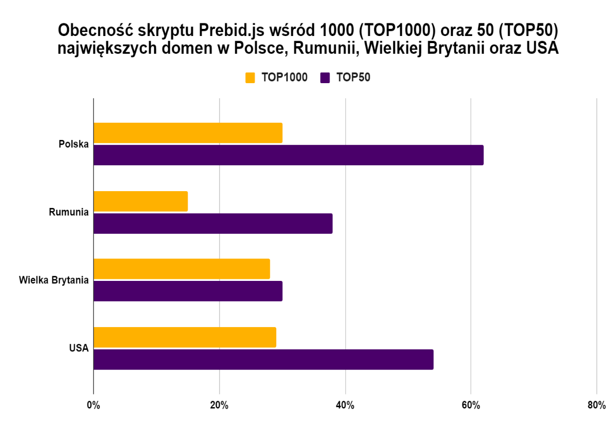Przy ograniczeniu liczby witryn do 50 największych z nich*, Prebid.js został zidentyfikowany prawie w u ⅔ – w 62%. Oznacza to, że więksi wydawcy okazali się być bardziej skłonni do korzystania z tej technologii.