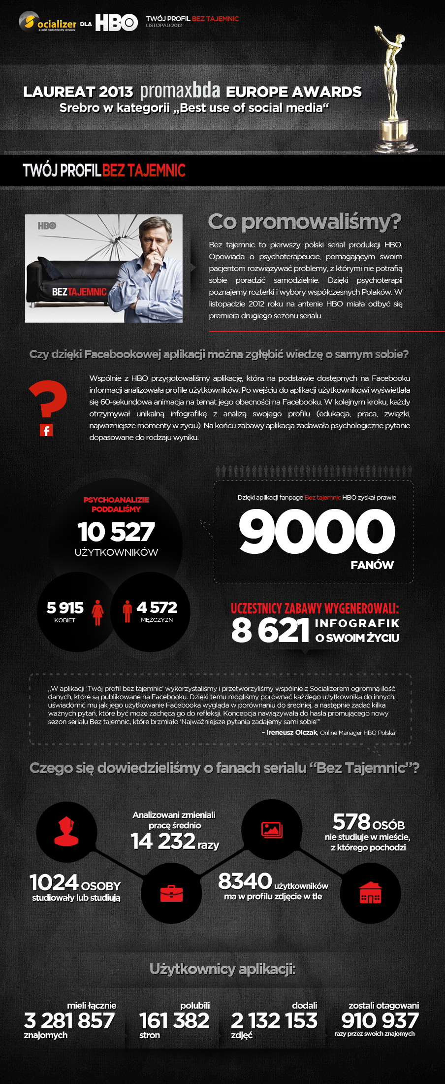 Wspólnie z HBO przygotowaliśmy aplikację, która na podstawie dostępnych na Facebooku informacji analizowała profile użytkowników. Po wejściu do aplikacji użytkownikowi wyświetlała się 60-sekundowa animacja na temat jego obecności na Facebooku. W kolejnym kroku, każdy otrzymywał unikalną infografikę z analizą swojego profilu (edukacja, praca, związki, najważniejsze momenty w życiu). Na końcu zabawy aplikacja zadawała psychologiczne pytanie dopasowane do rodzaju wyniku.