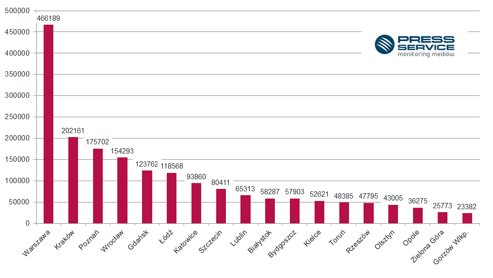 Aż 25 proc. medialnego tortu zagarnęła Warszawa (466,2 tys.). O ponad połowę mniejszy wynik zanotował Kraków (202,2 tys.), a trzecie miejsce zajął Poznań osiągając 175,7 tys. materiałów. Na kolejnych miejscach uplasowały się: Wrocław, Gdańsk, Łódź, Katowice i Szczecin. W TOP 10 znalazły się także Lublin i Białystok.