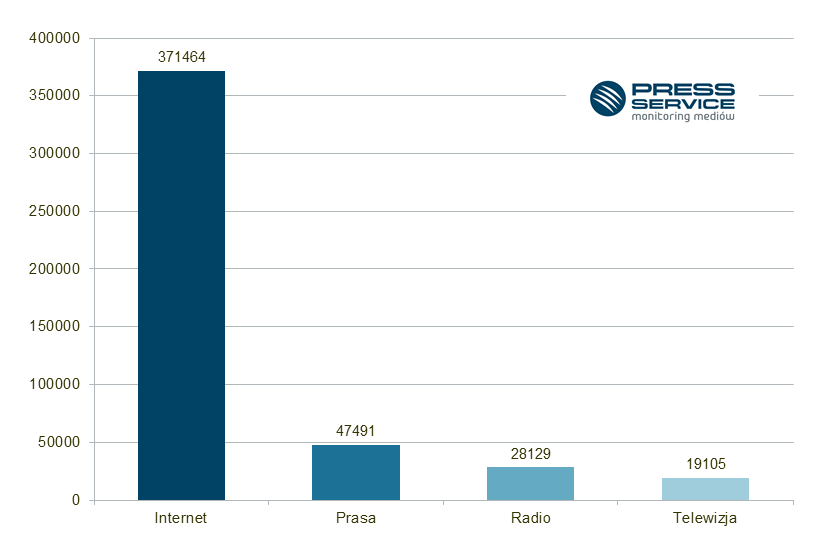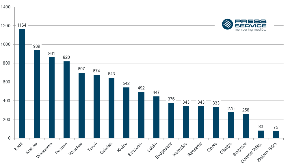 Ciekawie prezentuje się zestawienie, prezentujące miasta dominujące w tytułach newsów prasowych i internetowych. Dziennikarze najczęściej wymieniali Łódź, która pojawiła się w tytułach aż 1164 razy. Natomiast stolica znalazła się dopiero na trzecim miejscu, za Krakowem. Warszawa została przywołana w 861 tytułach.