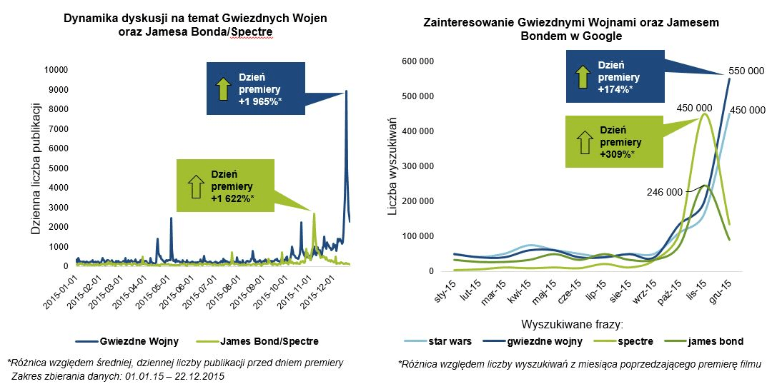W mediach społecznościowych apogeum zainteresowania przypadło na grudzień – to właśnie wtedy internauci najczęściej dyskutowali i wyszukiwali informacji na temat gwiezdnej sagi. Odpowiadając na pytanie czy te liczby to dużo czy mało: więcej w porównaniu do innego kinowego hitu 2015 roku, czyli premiery Spectre.