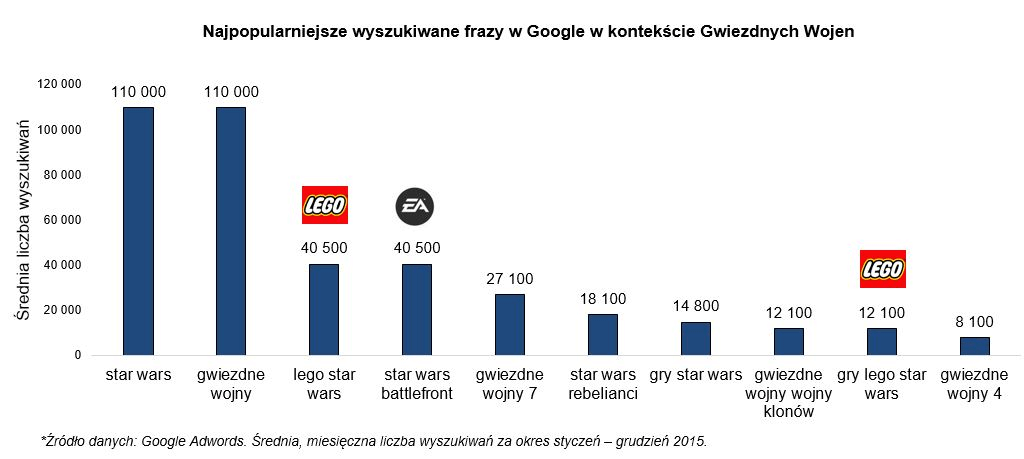 Internauci przejawiali duże zainteresowanie grami oraz marką Lego. Fraza lego star wars to trzecia, najczęściej wpisywana fraza w kontekście Gwiezdnych Wojen (klocki, gry). Dużą popularnością cieszyła się także najnowsza produkcja EA: Star Wars Battlefront, która miała premierę w listopadzie ubiegłego roku.