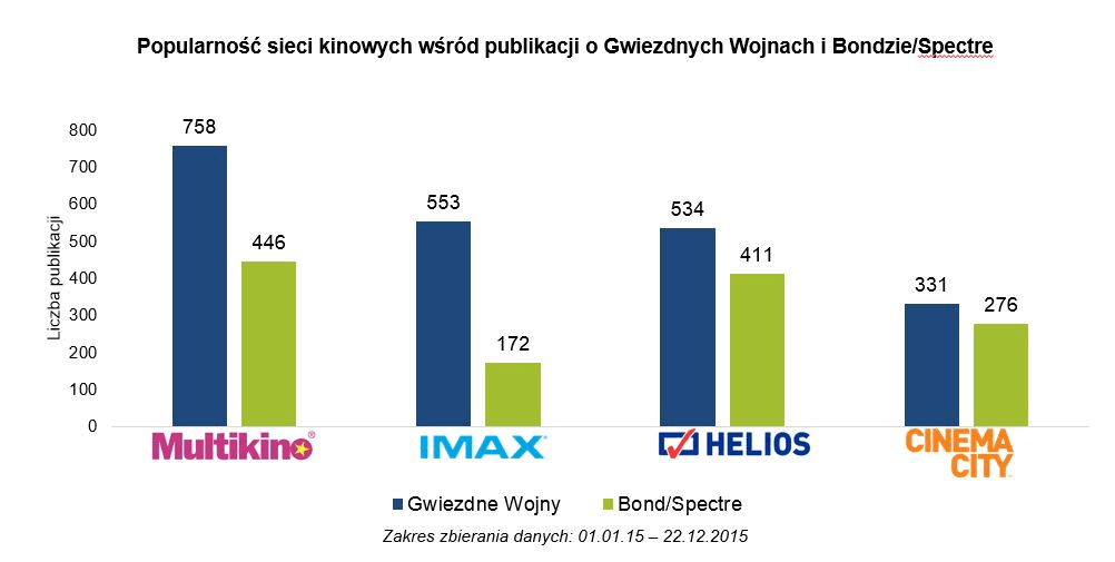Spośród wziętych pod uwagę sieci kinowych, najczęściej chwaliliśmy się wizytą w Multikinie – to właśnie to kino najczęściej pojawiało się wśród publikacji o Gwiezdnych Wojnach. Przebudzenie Mocy było chętniej wzmiankowane w kontekście kina, niż najnowsza część Bonda.