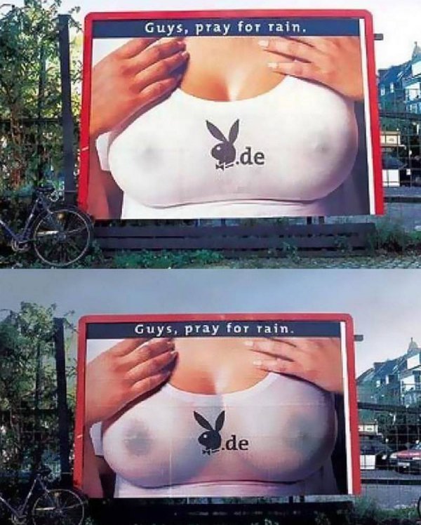 Inny ciekawy projekt – reklama magazynu Playboy. Niby wygląda normalnie, ale jak spadnie deszcz to efekt murowany.