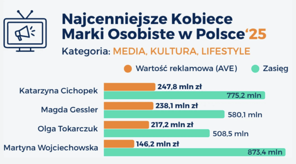 - IMM i „Forbes Women” opublikowały ranking „100 Najcenniejszych Kobiecych Marek Osobistych w Polsce” w kategorii „Media, kultura, lifestyle”. Na podium znalazły się: Katarzyna Cichopek, Magda Gessler i Olga Tokarczuk. Wartość ekspozycji medialnej każdej z tych marek przekracza 200 mln zł. >>> Zobacz pełny raport.