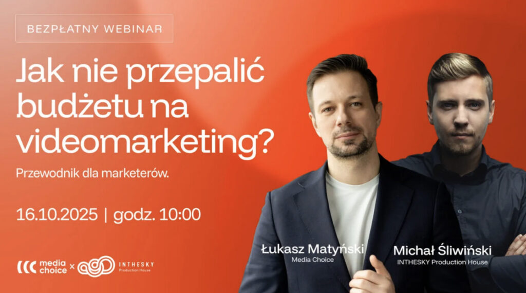 - Już 16 października o godz. 10:00 zapraszamy na darmowy webinar Jak nie przepalić budżetu na videomarketing? Przewodnik dla marketerów, który poprowadzą wspólnie Michał Śliwiński z INTHESKY Production House i Łukasz Matyński z Media Choice. >>> Zarejestruj się.