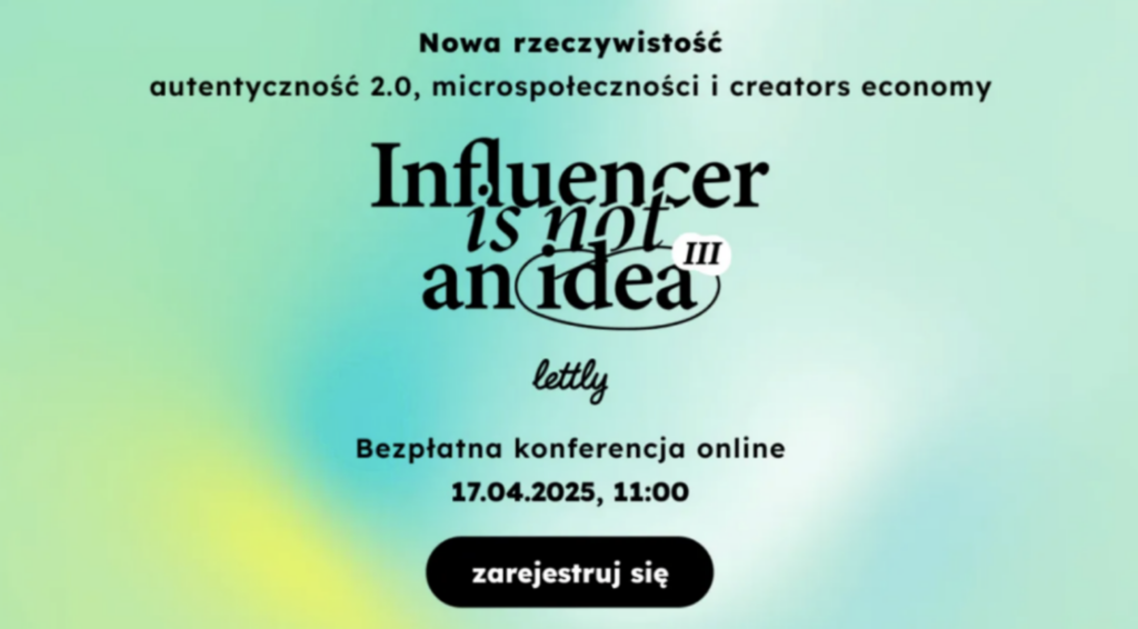 • Podczas konferencji online „Influencer is not an idea”, 17 kwietnia o godz. 11 dowiesz się m.in. „Czy mniej znaczy więcej? Mikrospołeczności i nisze w influencer marketingu”, „Jak marki przestają mówić, a zaczynają słuchać?”, oraz „Czy podcast może być słupem reklamowym?”. Zapisz się już dziś i wyprzedź konkurencję. Organizatorem bezpłatnego wydarzenie jest agencja Lettly.
