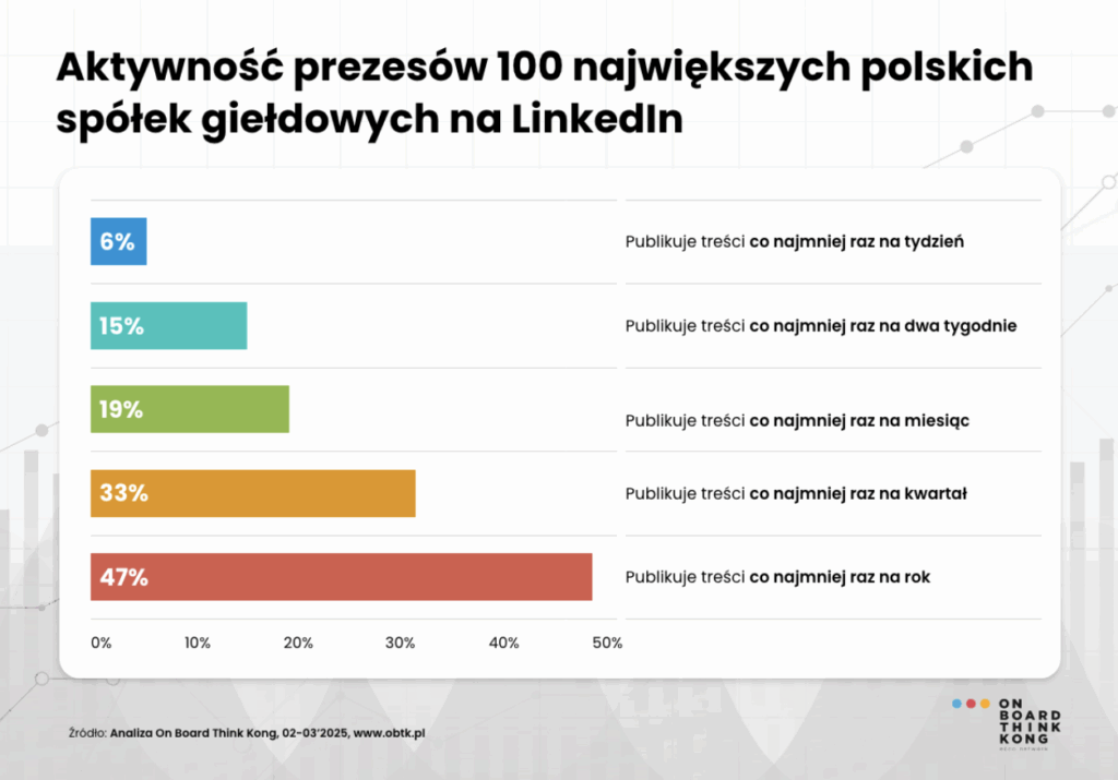 - Agencja On Board Think Kong przeanalizowała profile prezesów ze 100 największych polskich spółek giełdowych pod kątem ich komunikacji na Linkedinie. >>> Sprawdź wnioski.