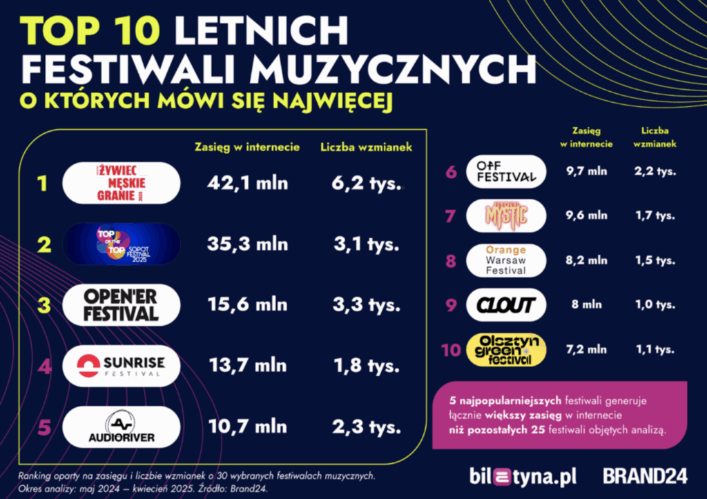 - Które imprezy muzyczne w Polsce generują największy zasięg w internecie? Jakie emocje generują takie wydarzenia? Portal biletyna.pl wraz z Brand24 i agencją Elephate przygotowały raport, w którym analizują popularność polskich letnich festiwali muzycznych w sieci. >>> Czytaj więcej.
