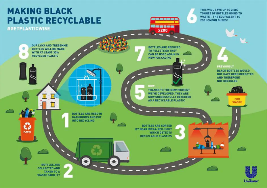 Unilever jest pionierem badań nad opracowaniem nowej receptury czarnego pigmentu, używanego do produkcji butelek z HDPE (polietylenu o wysokiej gęstości) dla kosmetyków TRESemme i Lynx (Axe). Dzięki zastosowaniu innowacyjnej formuły, pigment stanie się widoczny dla skanera w trakcie sortowania.