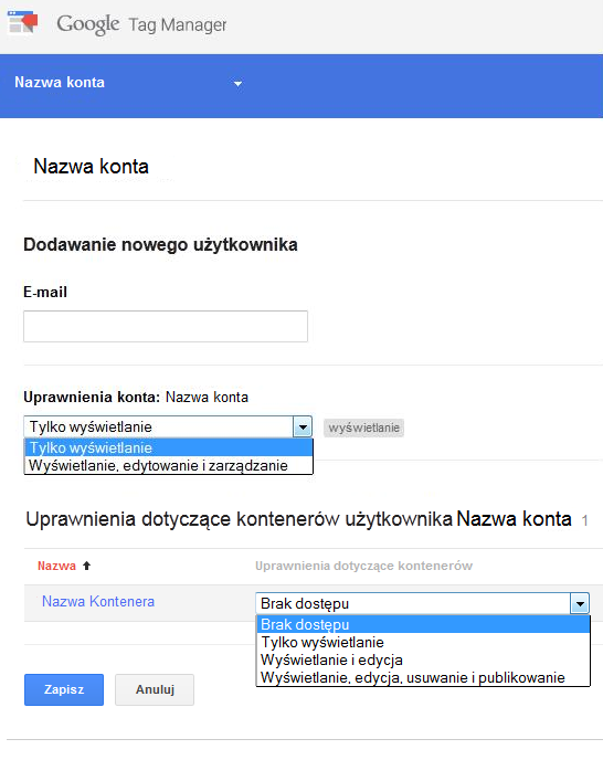 Z myślą o osobach, które stawiają pierwsze kroki z GTM, Google przygotowało dedykowany support i wiele materiałów, które mają zmniejszyć dysonans i w szybkim tempie wdrożyć nowego użytkownika. Tworząc GTM Google zadbało również o kwestię dostępów. Dostępy możemy podzielić na dwa poziomy. Pierwszy poziom to widok całego konta. W tym przypadku możemy udzielić jednego z 2 rodzajów dostępów. Pierwszy to wyświetlanie, edycja i zarządzanie. Drugi poziom jest przy każdym z kontenerów jakie mamy na koncie. W tym obszarze możliwości są znacznie większe. Istnieje między innymi szansa na ukrycie jednego z kontenerów. W tym celu wystarczy ustawić odpowiednie kombinacje na poziomie konta – Tylko wyświetlanie, a na poziomie kontenera – Brak dostępu. W przypadku ustawień na poziomie konta – wyświetlanie edycja i zarządzanie – nie mamy tej możliwości. Dostęp na poziomie kontenera pozwala na nadanie dostępów takich, jak: tylko wyświetlanie; wyświetlanie i edycja; wyświetlanie edycja, usuwanie i publikowanie. Tak zachowane dostępy zwiększają bezpieczeństwo firmy. Możemy doprowadzić do sytuacji, w której nie będą publikowane kody, których pochodzenie nie jest znane. Oznacza to, że o bezpieczeństwo wgrywania różnego rodzaju kodów możemy dbać już z poziomu nadawania dostępów.