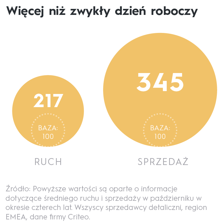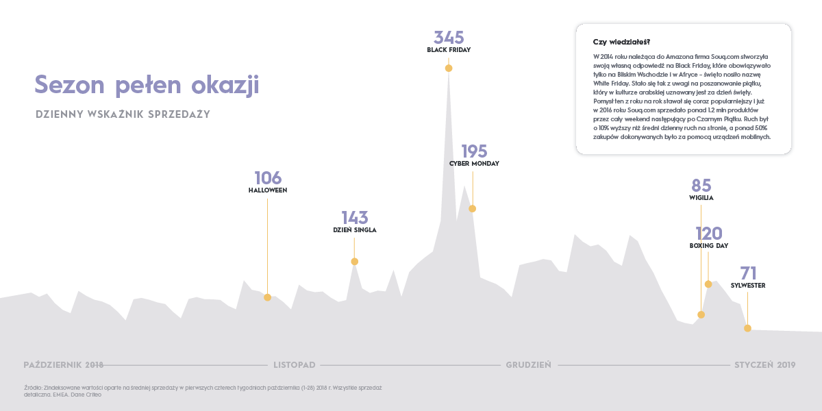 Black Friday stale pozostaje najbardziej popularnym dniem w regionie EMEA, a także najbardziej ulubionym wśród konsumentów, przy średnim wzroście o 117% w ciągu ostatnich pięciu lat. Ponadto, zgodnie z badaniem firmy Criteo, 67% sklepów spodziewa się znacznego wzrostu sprzedaży w czwartym kwartale 2019 roku.