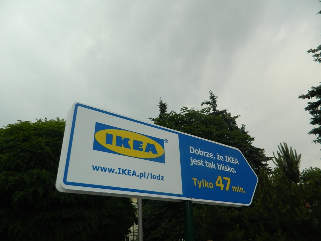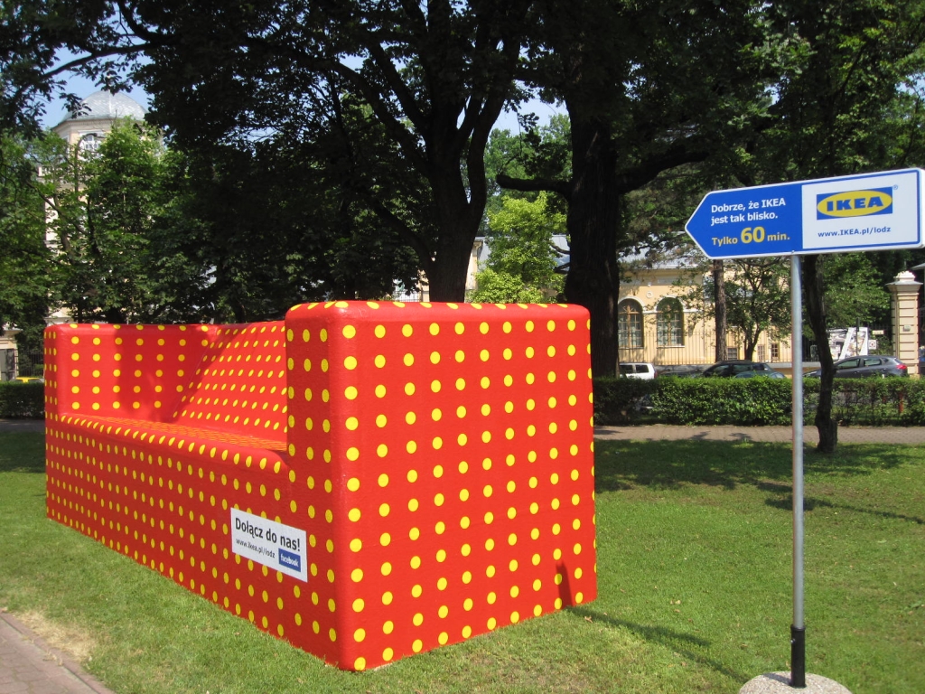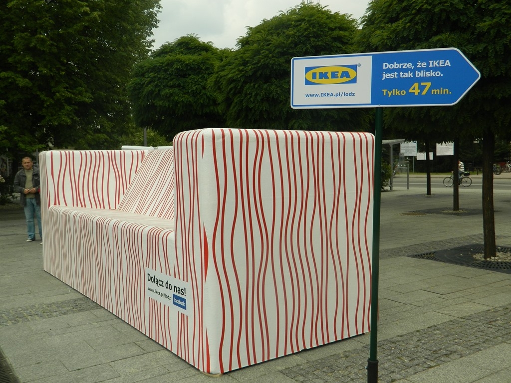 Obok kanap ustawione zostały drogowskazy, które w myśl hasła „Dobrze, że IKEA jest tak blisko” wskazują odległość do sklepu IKEA Łódź.
