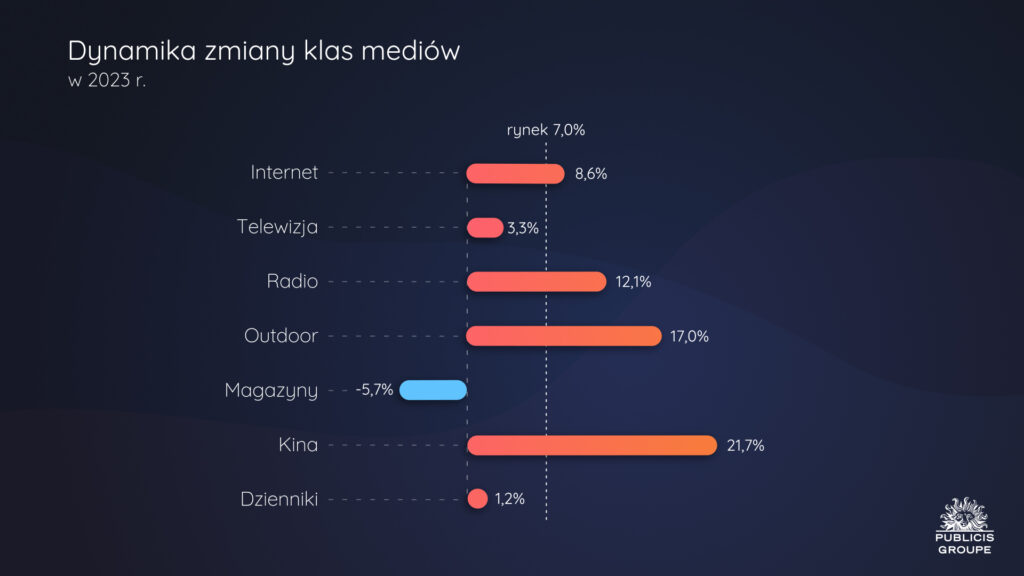 W 2023 r. wzrosły inwestycje reklamowe przeznaczone na internet, telewizję, radio, outdoor, kino oraz dzienniki. Zmalały jedynie nakłady na magazyny. Najszybciej rosną wciąż inwestycje reklamowe w kinie – ponad 21,7% (wolumenowo było to o 34 mln zł więcej niż w roku ubiegłym). Drugą najszybszą dynamiką może pochwalić się outdoor, który miał szczególnie udaną drugą połowę roku. Przyspiesza również radio, po kolejnym mocnym kwartale pozostaje siłą napędową całego rynku reklamowego. Ponadto na umacnianie rynku reklamy przełożyły się inwestycje w internet, którego dynamika również pozostaje wyższa od rynkowej. Z analizy wolumenowej wynika, że budżety internetowe wzrosły o blisko 419 mln zł. Nieco spowolniła dynamika budżetów przeznaczanych na telewizję. Wolumenowo inwestycje telewizyjne wzrosły o niemal 148 mln zł. Dodatnią dynamikę odnotowaliśmy ponadto w dziennikach. Jedynym medium o wyniku ujemnym w 2023 r. są magazyny, ze spadkiem o blisko 10,5 mln zł.