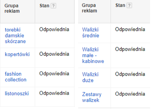 Ostatnim wykorzystanym typem kampanii była kampania produktowa. Działania zostały podzielone etapowo, dlatego na początku skupiono się tylko na wyświetlaniu jednego typu produktów, który generował najwyższy współczynnik konwersji oraz największą liczbę transakcji. Następnie, oceniając skuteczność pozostałych typów produktów, uruchomiono dodatkowe kampanie i grupy reklamowe, kategoryzując każdy z segmentów produktów. Kampanie tworzone były z uwzględnieniem najwyższej marży z danych produktów czy pod kątem gabarytów danych produktów – walizek. W ten sposób można było optymalizować kampanie produktowe pod najbardziej rentowne kategorie produktów, zwiększając tym samym ROAS. Przykładowy podział widoczny poniżej: