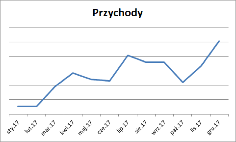 Największy wzrost przychodów z 2017 roku widoczny jest w okresie wakacyjnym oraz świątecznym (grudzień), co prezentuje poniższy wykres: