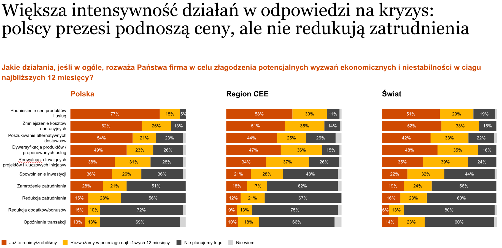 W odpowiedzi na krótkoterminowe wyzwania gospodarcze, prezesi firm w Polsce, podobnie jak ich koledzy z całego świata, podejmują działania mające na celu pobudzenie wzrostu przychodów i obniżenie kosztów. Aż 77% z nich (“tylko” 58% prezesów w naszym regionie) twierdzi, że zaczęło już wdrażać podwyżki cen – narzędzie, po które do tej pory sięgnęło zaledwie 51% globalnych dyrektorów. Jednocześnie prezesi firm globalnych i tych z Polski doskonale zdają sobie sprawę z możliwości wystąpienia zakłóceń w przyszłości: aż 54 % polskich szefów – znacznie więcej niż w naszym regionie (45%) i na całym świecie (prawie 40% ) uważa, że ich firmy nie będą w stanie utrzymać się na rynku za dekadę, jeśli będą podążać obecną ścieżką. Liderzy biznesowi są świadomi, że zagrożenia, przed którymi stoją, mają wręcz charakter bardzo poważny – a więc deklarują, że podejmą odpowiednie działania. W Polsce ten odsetek jest wyjątkowo wysoki.