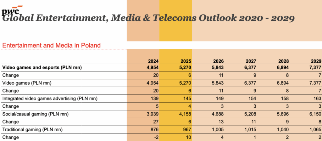 Gry wideo i e-sport notują drugi największy prognozowany wzrost przychodów do 2029 roku na polskim rynku E&M, na poziomie 8,8 proc. Obserwuje się tutaj przede wszystkim wzrost obszaru social/casual gaming (10,3 proc. CAGR), przy dalszym wzroście gier aplikacyjnych (9,5 proc. CAGR), kosztem gier przeglądarkowych (-4,7 proc. CAGR). Bardzo duży prognozowany wzrost przychodów obserwuje się w reklamach w grach aplikacyjnych (13,1 proc. CAGR) – jest to jedna z najbardziej akceptowalnych form reklam przez użytkowników.