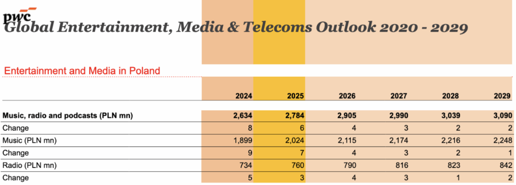 Wszystkie dane, wykresy i diagramy zostały stworzone w oparciu o 26. edycję raportu Global Entertainment & Media Outlook 2025-2029, który prezentuje pięcioletnią perspektywę dla 17 segmentów rynku rozrywki i mediów w 54 terytoriach na świecie. Wszystkie przychody są szacowane w dolarach amerykańskich. Kursy wymiany z 2024 r. zostały zastosowane do wszystkich lat historycznych i przyszłych, aby wyeliminować wahania walut maskujące podstawowe trendy w branży. Kursy wymiany walut jaki został zastosowany w raporcie to: 1 USD = 3,962 PLN.