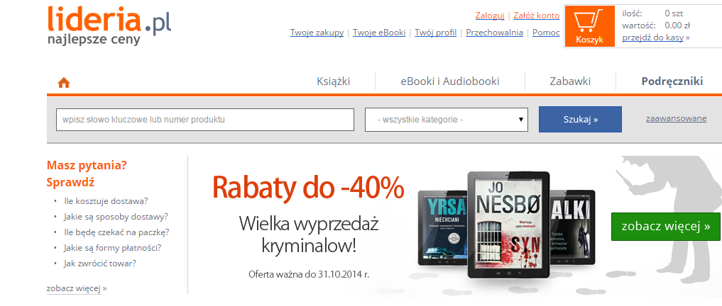 W ramach współpracy z Allegro powstaje unikalna oferta tylko dla klientów Liderii, która obejmie akcje dedykowane, dotyczące poszczególnych wydawnictw, autorów i serii wydawniczych. Jedną z bardziej istotnych zmian będzie również obniżenie kosztów dostawy dla klientów Allegro. Lideria.pl od ponad 10 lat korzysta z Allegro jako jednego z kluczowych kanałów sprzedaży, gdzie posiada ponad 40 tys. pozytywnych opinii kupujących.