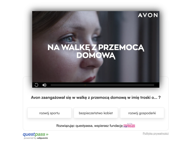 W ramach kampanii questvertisingowej Questpass_>> wyemitował trzy kreacje informujące o działaniach Avon na rzecz: