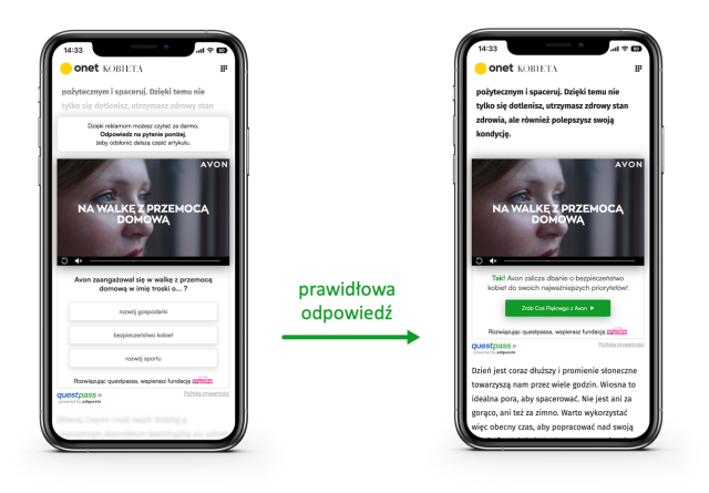 Czytelniczki portalu Onet Kobieta były proszone o odpowiedź na pytanie dotyczące treści reklamy, co otwierało dostęp do dalszej części aktualnie czytanego artykułu. Poprawna odpowiedź wynikała wprost z reklamy i była jednocześnie potwierdzeniem zrozumienia przekazu Avon, co można sprawdzić na tym interaktywnym demo.