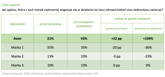 W wyniku kampanii questvertisingowej przekonania osób na temat tego, która z marek najmocniej angażuje się w działania na rzecz kobiet i dobrostanu zwierząt, znacząco się zmieniły. Avon uzyskał już 43% wskazań (wzrost o 22 punkty procentowe, czyli o ponad 100%) i tym samym wyprzedził markę, która była poprzednio niekwestionowanym pierwszym skojarzeniem z aktywnością prospołeczną. I to w efekcie zaledwie jednej, mądrze przeprowadzonej kampanii.