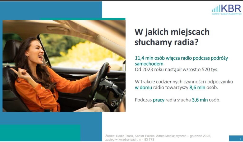 Badanie wyraźnie wskazuje, że samochód pozostaje najważniejszym miejscem słuchania radia. W 2025 roku ponad 11,4 mln osób deklarowało kontakt z radiem podczas podróży samochodem. To potwierdza, że radio idealnie wpisuje się w codzienne schematy mobilności – dojazdy do pracy, szkoły czy codzienne obowiązki.