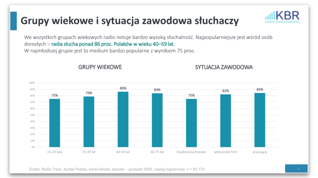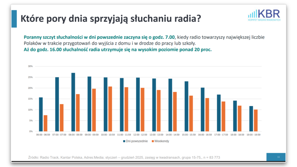 Dane te pokazują, że radio nie jest wyłącznie medium starszych odbiorców. Choć młodsze grupy chętniej sięgają po treści cyfrowe, radio nadal pozostaje obecne w ich codziennym rytmie dnia – często jako medium towarzyszące innym aktywnościom.