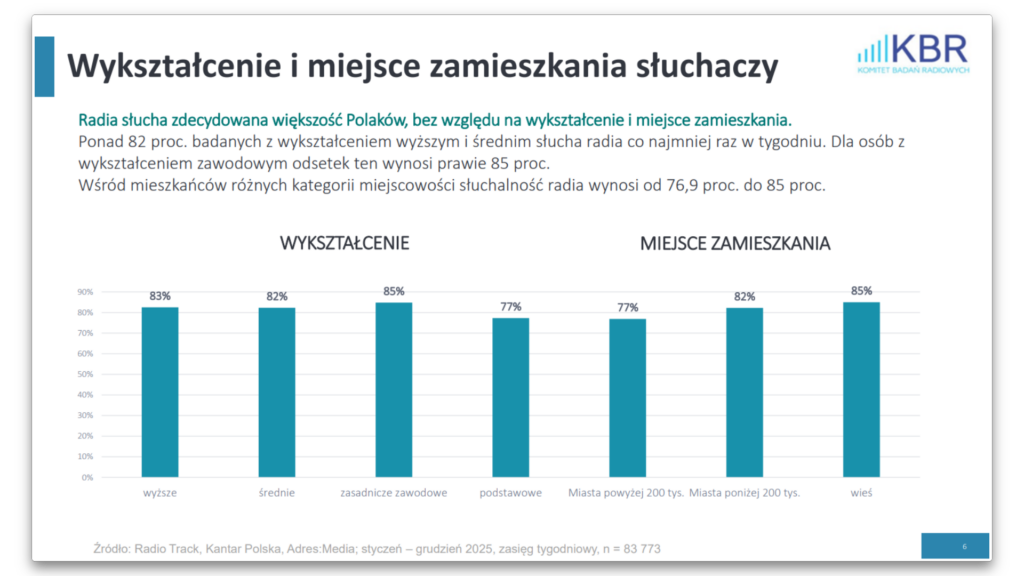Jednym z kluczowych wniosków płynących z badania „Radio Track” jest uniwersalność radia. Medium dociera do szerokiego spektrum odbiorców – niezależnie od wieku, miejsca zamieszkania czy poziomu wykształcenia.
