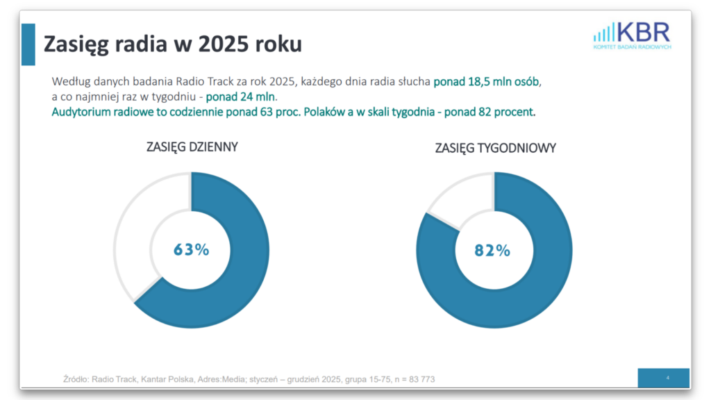 Wyniki badania „Radio Track 2025” potwierdzają, że radio wciąż pełni istotną rolę w codziennym życiu Polaków. Codzienny zasięg medium przekracza 63% populacji, a tygodniowy sięga ponad 82%, co czyni radio jednym z najpowszechniej konsumowanych kanałów mediowych w kraju.