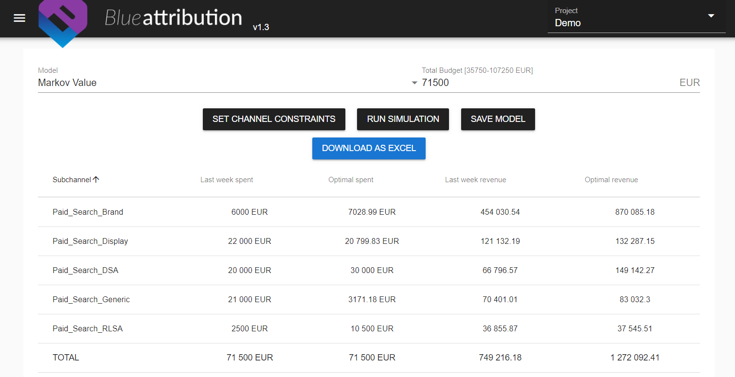Algorytm sam zwraca informacje o pożądanym budżecie wraz z najlepszym podziałem wśród kanałów, ale możemy również wprowadzić własną kwotę (i ewentualne ograniczenia, jeżeli uznajemy, że nie wydamy mniej lub więcej na dany kanał).