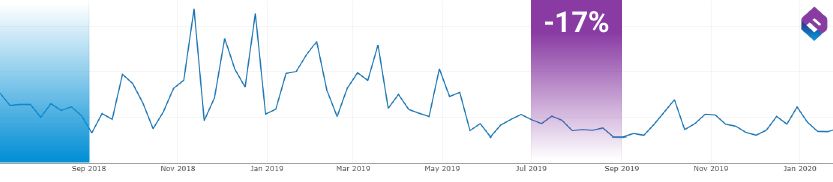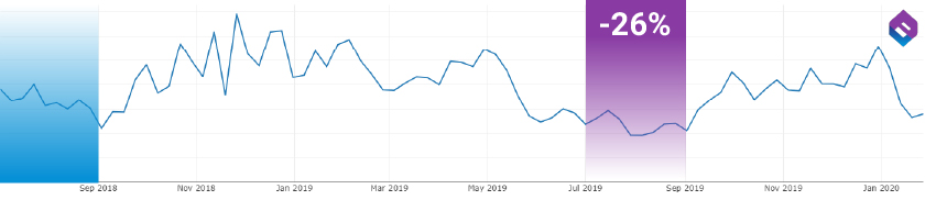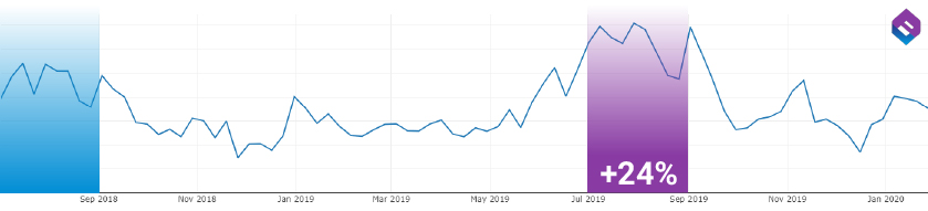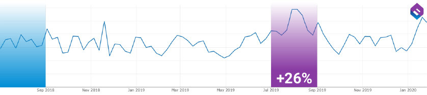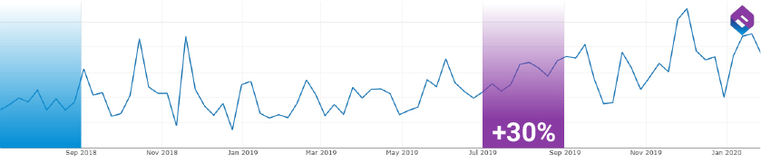 Kolorem zaznaczono okresy sezonu letniego dla 2018 i 2019 roku, gdzie popularność biur podróży w oczywisty sposób wzrasta – co dla 2019 roku jest jednocześnie okresem optymalizowania kanałów reklamowych. Porównując sezon do sezonu, widzimy znaczny i bardziej gwałtowny wzrost.