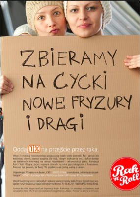 Za oryginalną nazwą idą równie oryginalne projekty. Rak’n’Roll jest znany przede wszystkim ze swojej najgłośniejszej kampanii: „Zbieramy na cycki, nowe fryzury i dragi”.