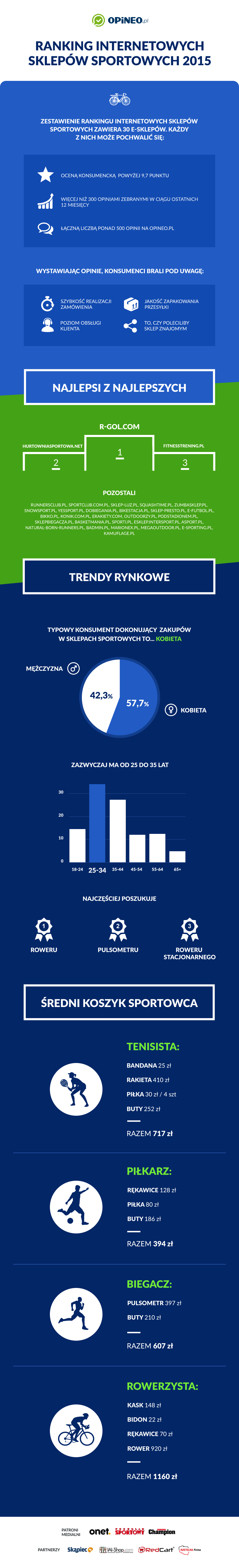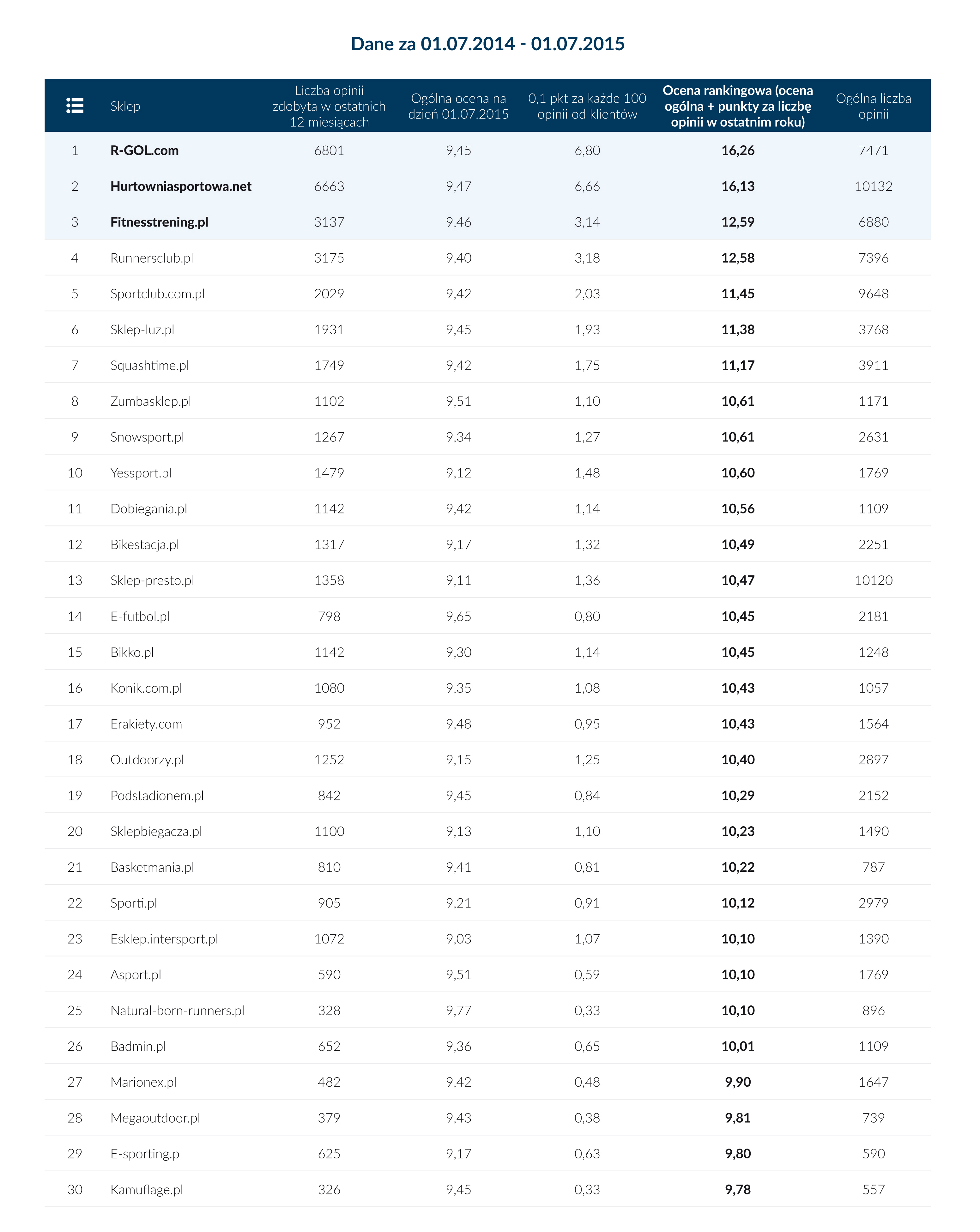 Finałowe zestawienie Rankingu Internetowych Sklepów Sportowych Opineo 2015 zawiera 30 najlepiej ocenianych przez konsumentów e-sklepów. Są wśród nich zarówno sportowe hipermarkety, jak i niszowe sklepy zorientowane na konkretnego klienta i określoną aktywność fizyczną (sklepy dla biegaczy, miłośników futbolu, rowerowych obieżyświatów, pasjonatów jeździectwa, osób trenujących badminton, outdoorowców i skaterów):