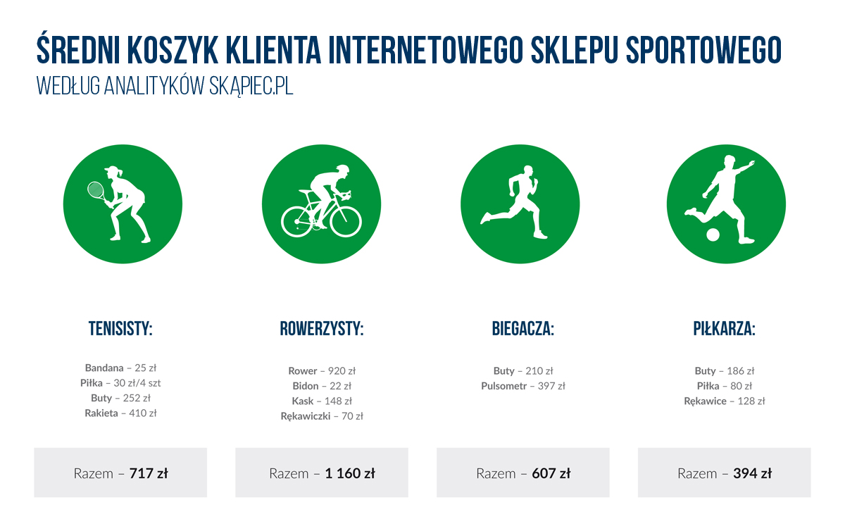 Według raportu CBOS „Aktywność fizyczna Polaków”, najchętniej uprawiane dyscypliny w Polsce to jazda na rowerze (51%) i pływanie (28%), w dalszej kolejności bieganie (18%), turystyka piesza (16%), piłka nożna (14%), siatkówka (14%), gimnastyka, fitness, aerobik (13%). Analitycy serwisu Skąpiec.pl przyjrzeli się zakupowym preferencjom klientów e-sklepów sportowych. Niezależnie od pory roku, najpopularniejszymi produktami w Internecie są właśnie rowery. W miesiącach wiosennych i letnich na pierwsze miejsca wskakują również pulsometry i komputery sportowe używane głównie przez amatorów joggingu. Średni koszyk zakupowy biegacza wynosi ok. 600 zł, rowerzysty — prawie dwa razy tyle.