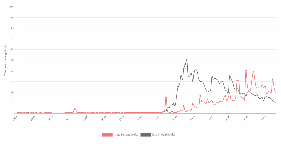 Na wykresie Vivy! prześledzić można również internetowe przepychanki gwiazd. Porównując wyniki Anny Lewandowskiej i Ewy Chodakowskiej łatwo zauważyć moment, w którym internetowa kariera tej pierwszej zaczęła szybować w górę, a tej drugiej – pikować w dół. Pikanterii dodaje fakt, że stało się to tuż po tym, jak obie (rzekomo rywalizujące ze sobą) trenerki zrobiły sobie wspólne zdjęcie.
