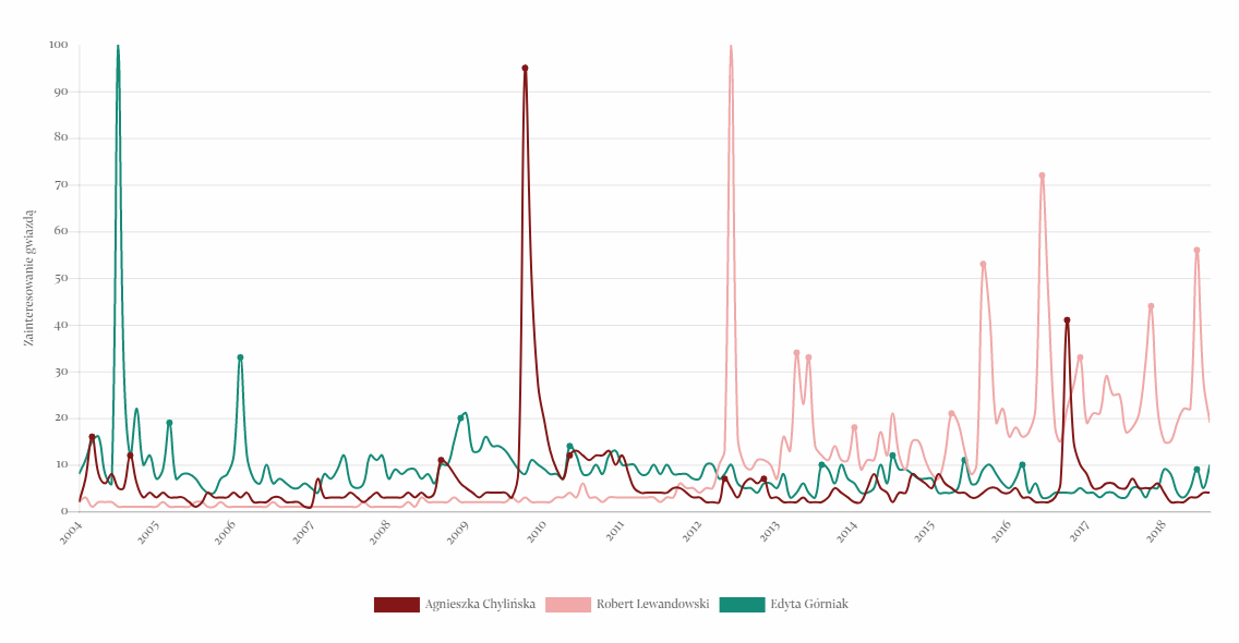 Na wykresach widać, kiedy internauci najczęściej wpisywali w wyszukiwarkę nazwiska takich gwiazd, jak Robert Lewandowski, Ewa Chodakowska czy Magda Gessler. Co ciekawe, to właśnie tę trójkę można dziś nazwać najpopularniejszymi polskimi gwiazdami w sieci. Każdego miesiąca Google oceniał bowiem zainteresowanie daną osobą w skali od 1-100 punktów. Po podliczeniu wyników z ostatnich czternastu lat pierwsza dziesiątka rankingu internetowej popularności przedstawia się następująco: