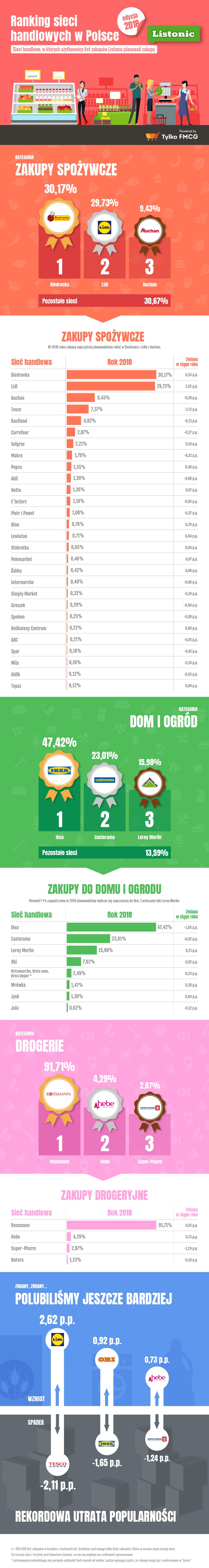 Listonic zaprezentował czwartą już edycję podsumowania popularności sieci handlowych w Polsce. Choć na tegorocznym podium znajdziemy tych samych zwycięzców, co w roku ubiegłym, to na horyzoncie można już zauważyć nadchodzące przetasowania.