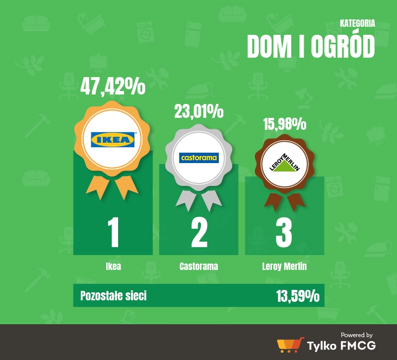 Podział w rankingu sieci handlowych dla kategorii zakupów do domu i ogrodu jest prosty i od wielu lat niezmienny: IKEA, Castorama, Leroy Merlin, za nimi – Obi, a potem kilka jeszcze mniejszych sieci. Chociaż w edycji 2018 IKEA straciła kilka punktów procentowych, to dystans, jaki dzieli ją od Castoramy, jest nadal gigantyczny. Zresztą trudno się temu dziwić: IKEA to nie tylko sklep budowlany, lecz instytucja rodzinno-rozrywkowa, do której można iść na przystępny cenowo obiad lub warsztaty z dziećmi, przy okazji kupując kolejną poduszkę do kanapy lub szwedzkie słodycze.